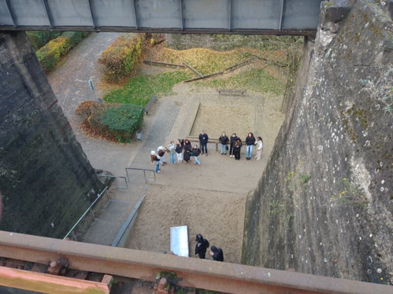 Am Landschaftspark angekommen, teilten wir uns in klassengemischte Gruppen von ca. 20 Personen auf. Mit verschiedenen Gruppenleitern gingen wir in diverse Richtungen auf dem Gelände in Richtung „Hochofen 5“, welcher unser Ziel war.